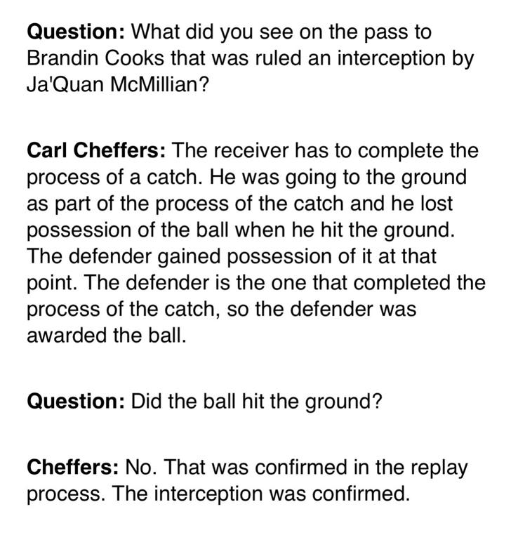 NFL referee Carl Cheffers explains why it was an interception: "The receiver has to complete the process of the catch. He was going to the ground as part of the process of the catch and he lost possession of the ball when he hit the ground. The defender gained possession of it at that point. The defender is the one who completed the process of the catch and was awarded the ball." DID THE BALL HIT THE GROUND? Cheffers: "No. That was confirmed in the replay process. The interception was confirmed."